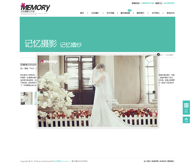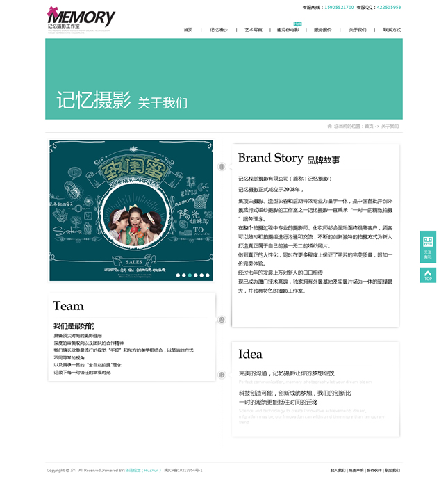 記憶視覺攝影有限公司(簡(jiǎn)稱:記憶攝影)記憶攝影正式成立于2008年,集頂尖攝影、造型妝容和后期特效專業(yè)力量于一體,是中國(guó)首批開創(chuàng)外景旅行式婚紗攝影的工作室之一記憶攝影一直秉承“一對(duì)一的精致拍攝”服務(wù)理念。在整個(gè)拍攝過程中專業(yè)的攝影師、化妝師都會(huì)至始至終跟隨客戶,顧客可以隨時(shí)和拍攝組進(jìn)行溝通和交流,不斷的創(chuàng)新獨(dú)特的拍攝方式為新人打造真正屬于自己的獨(dú)一無二的婚紗照片。做到真正的人性化,同時(shí)在更多程度上保證了照片的完美質(zhì)量,附加一份完美體驗(yàn)。